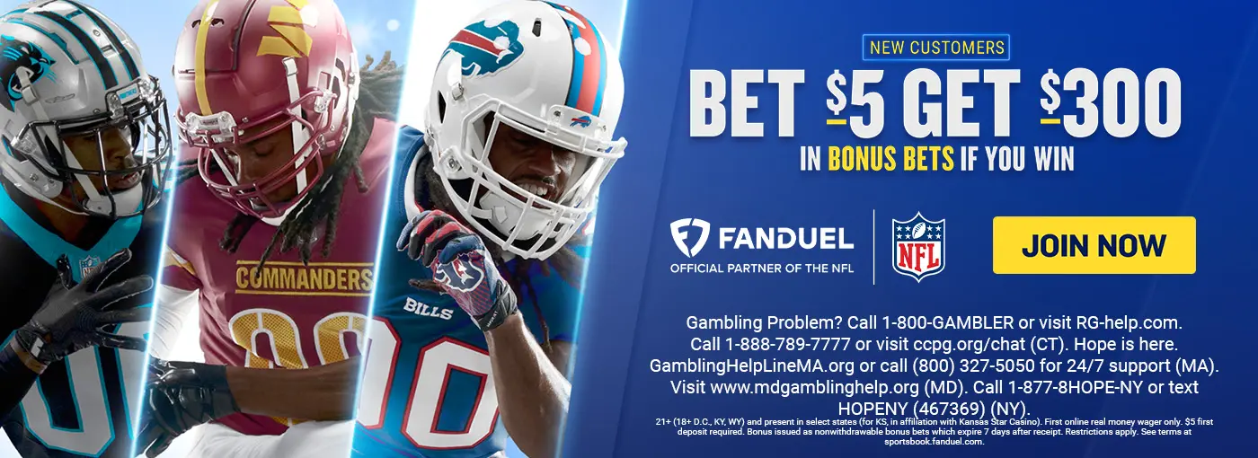 Must be present in select states (for KS, in affiliation with Kansas Star Casino). First online real money wager only. $5 first deposit required. Bonus issued as nonwithdrawable bonus bets which expire 7 days after receipt. Restrictions apply. See terms at sportsbook.fanduel.com.